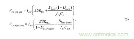 在圖4中,步驟4和5是指分別由降壓和升壓工作模式設(shè)定的輸入和輸出電容值。高密度設(shè)計(jì)越來越多地將數(shù)個(gè)X5R-或X7R-介質(zhì)陶瓷元件組合在一起,有時(shí)還附帶著一個(gè)小尺寸電解電容器來實(shí)現(xiàn)大批量儲能功能。方程式4使用針對峰值到峰值的紋波電壓,在假定沒有等效串聯(lián)電阻 (ESR) 紋波分量的情況下設(shè)定基線電容估計(jì)值。