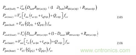 方程式12和13分別計(jì)算降壓和升壓模式下的傳導(dǎo)、開關(guān)和柵極驅(qū)動損耗。針對降壓-升壓模式的相應(yīng)表達(dá)式是方程式12和13的權(quán)重組合,其依據(jù)是降壓-升壓窗口中的運(yùn)行點(diǎn),并且將頻率除以2。