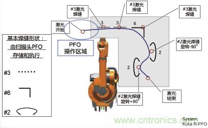 除了激光拼焊,激光飛行焊也已經(jīng)被廣泛應(yīng)用于汽車(chē)車(chē)身及其他零部件的焊接。激光飛行焊是將振鏡焊接頭與機(jī)器人的運(yùn)動(dòng)結(jié)合起來(lái),實(shí)現(xiàn)高效靈活的激光焊接。振鏡(PFO)及飛行焊的原理見(jiàn)圖4、5、6。其中PFO可以通過(guò)兩片鏡片的旋轉(zhuǎn),實(shí)現(xiàn)激光焦點(diǎn)在工件上的快速靈活移動(dòng)和定位,可以大大提供激光焊接時(shí)的動(dòng)態(tài)性能,更加高效。而機(jī)器人則可以擴(kuò)展焊接范圍,以實(shí)現(xiàn)更大零件的焊接。兩者的結(jié)合,則可以實(shí)現(xiàn)優(yōu)勢(shì)互補(bǔ),達(dá)到高效、靈活、低成本的激光焊接。