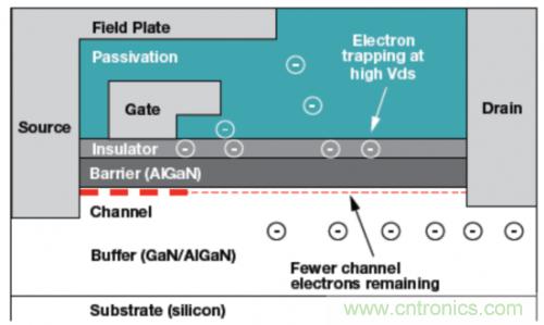 圖1:一個GaN器件的電路橫截面顯示被陷獲的電子如何通過減少通道層中的電子數(shù)量來增加Rds導通電阻。