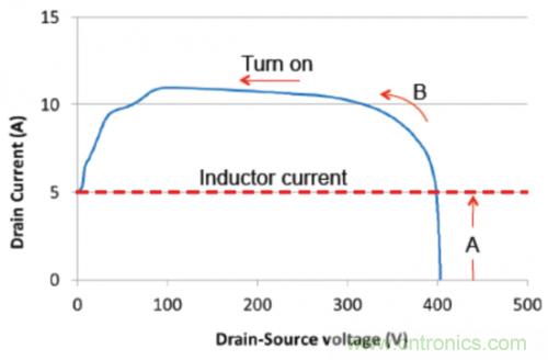 器件應力由使用圖2中所示拓撲的升壓轉(zhuǎn)換器顯示。圖3中顯示的是初級側(cè)開關 (FET1) 上硬開關接通變換的仿真結(jié)果。輸入電壓為200V,而電感器電流為5A(負載電流大約為2.5A)。在這個情況下,當FET1關閉時,由于鉗制FET (FET2) 導電,它的漏電壓大約鉗制在400V。因此,當FET1接通時,它需要在Vds開始下降之前灌入整個電感器電流(區(qū)域A)。