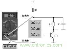 檢測這一電路中的3只二極管最為有效的方法是測量二極管上的直流電壓,如圖所示是測量時(shí)接線示意圖。如果測量直流電壓結(jié)果是1.8V左右,說明3只二極管工作正常;如果測量直流電壓結(jié)果是0V,要測量直流工作電壓+V是否正常和電阻R1是否開路,與3只二極管無關(guān),因?yàn)?只二極管同時(shí)擊穿的可能性較小;如果測量直流電壓結(jié)果大于1.8V,檢查3只二極管中有一只開路故障。