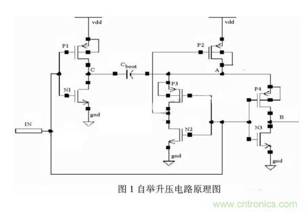 自舉升壓電路的原理圖如圖1所示。所謂的自舉升壓原理就是,在輸入端IN輸入一個(gè)方波信號(hào),利用電容Cboot將A點(diǎn)電壓抬升至高于VDD的電平,這樣就可以在B端輸出一個(gè)與輸入信號(hào)反相,且高電平高于VDD的方波信號(hào)。具體工作原理如下: