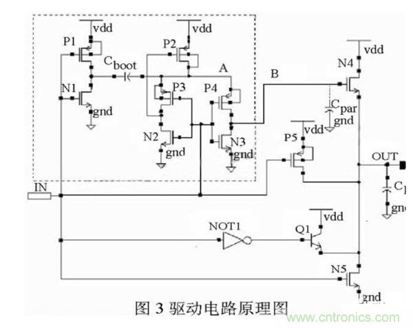 圖3中給出了驅(qū)動(dòng)電路的電路圖。驅(qū)動(dòng)電路采用Totem輸出結(jié)構(gòu)設(shè)計(jì),上拉驅(qū)動(dòng)管為NMOS管N4、晶體管Q1和PMOS管P5。下拉驅(qū)動(dòng)管為NMOS管N5。圖中CL為負(fù)載電容,Cpar為B點(diǎn)的寄生電容。虛線框內(nèi)的電路為自舉升壓電路。
