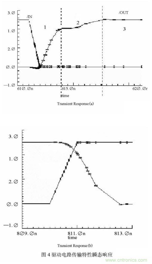 驅(qū)動(dòng)電路的傳輸特性瞬態(tài)響應(yīng)在圖4中給出。其中(a)為上升沿瞬態(tài)響應(yīng),(b)為下降沿瞬態(tài)響應(yīng)。從圖4中可以看出,驅(qū)動(dòng)電路上升沿明顯分為了三個(gè)部分,分別對(duì)應(yīng)三個(gè)上拉驅(qū)動(dòng)管起主導(dǎo)作用的時(shí)期。1階段為Q1、N4共同作用,輸出電壓迅速抬升,2階段為N4起主導(dǎo)作,使輸出電平達(dá)到VDD,3階段為P5起主導(dǎo)作用,維持輸出高電平為VDD。而且還可以縮短上升時(shí)間,下降時(shí)間滿足工作頻率在兆赫茲級(jí)以上的要求。