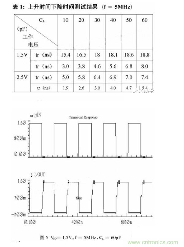 驅(qū)動(dòng)電路基于Samsung AHP615 BiCMOS工藝設(shè)計(jì)并經(jīng)過(guò)Hspice仿真驗(yàn)證。在表1中給出了電路在不同工作電壓、不同負(fù)載條件下的上升時(shí)間tr和下降時(shí)間tf 的仿真結(jié)果。在圖5中給了電路工作在輸入電壓1.5V、工作頻率為5MHz、負(fù)載電容60pF條件下的輸出波形。