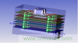 這里我們以0402的AC耦合電容為例進行仿真,一端Botm層通過換層過孔連接Top面的AC耦合電容,另外一端通過過孔再連接到Art12層,這里我們分別仿真3種情況;電容掏空到GND02層,X方向掏34mil,Y方向掏66mil(Case1)。模型建好后的3D效果圖如圖4所示。