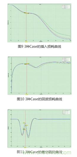 下面是Case1,Case2,Case3三種情況下AC耦合電容插入損耗,回波損耗以及差分阻抗曲線,分別如圖9,圖10及圖11所示。這里使用SnpExpert對S參數(shù)進行比較。