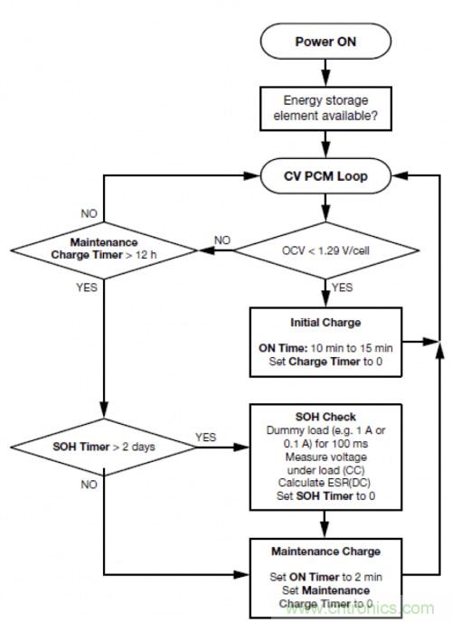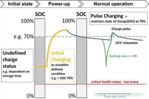 注:第2-5步補(bǔ)償自放電效應(yīng)并通過這種涓流充電使儲(chǔ)能元件保持健康狀態(tài),同時(shí)還維持更長(zhǎng)的時(shí)間。