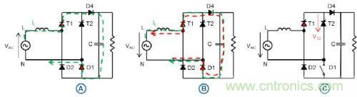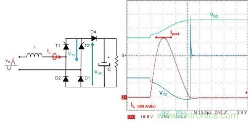 在 90°相角時(shí),T1和D1導(dǎo)通。浪涌提高電流,并致使D4導(dǎo)通,因?yàn)镻FC電感保持電壓。浪涌電流旁通二極管D4,避免燒毀PFC續(xù)流二極管(D3)。