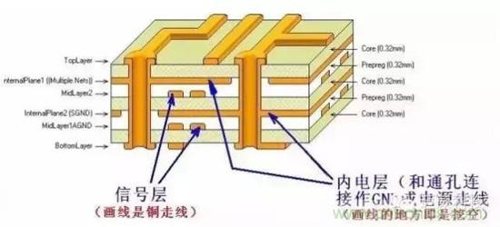 通常簡稱為內(nèi)電層,僅在多層板中出現(xiàn),PCB板層數(shù)一般是指信號層和內(nèi)電層相加的總和數(shù)。與信號層相同,內(nèi)電層與內(nèi)電層之間、內(nèi)電層與信號層之間可通過通孔、盲孔和埋孔實(shí)現(xiàn)互相連接。