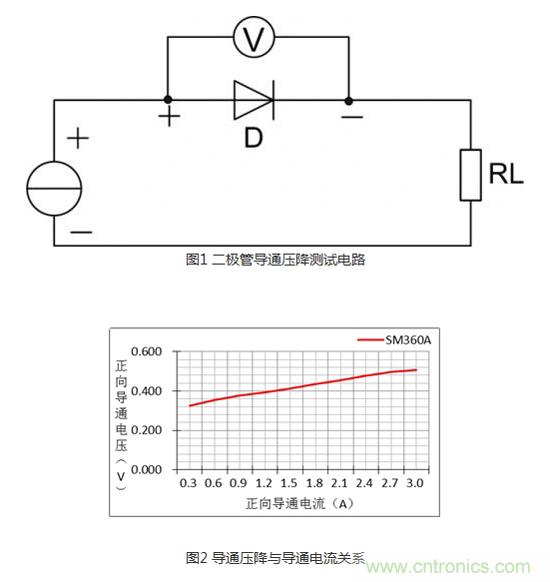 在二極管兩端加正向偏置電壓時,其內(nèi)部電場區(qū)域變窄,可以有較大的正向擴(kuò)散電流通過PN結(jié)。只有當(dāng)正向電壓達(dá)到某一數(shù)值(這一數(shù)值稱為“門檻電壓”,鍺管約為0.2V,硅管約為0.6V)以后,二極管才能真正導(dǎo)通。但二極管的導(dǎo)通壓降是恒定不變的嗎?它與正向擴(kuò)散電流又存在什么樣的關(guān)系?通過下圖1的測試電路在常溫下對型號為SM360A的二極管進(jìn)行導(dǎo)通電流與導(dǎo)通壓降的關(guān)系測試,可得到如圖2所示的曲線關(guān)系:正向?qū)▔航蹬c導(dǎo)通電流成正比,其浮動壓差為0.2V。從輕載導(dǎo)通電流到額定導(dǎo)通電流的壓差雖僅為0.2V,但對于功率二極管來說它不僅影響效率也影響二極管的溫升,所以在價格條件允許下,盡量選擇導(dǎo)通壓降小、額定工作電流較實際電流高一倍的二極管。
