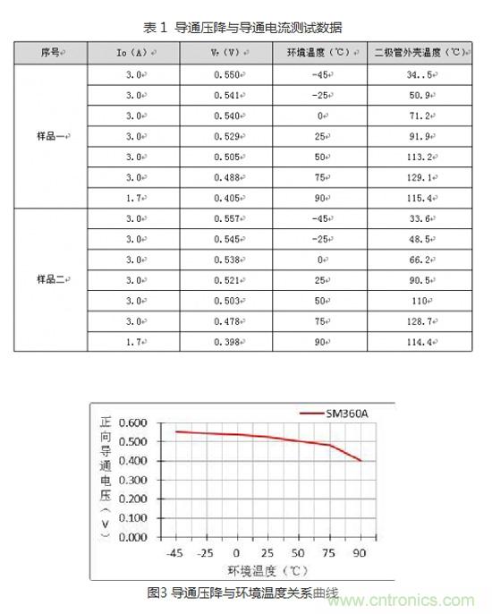 在我們開發(fā)產(chǎn)品的過程中,高低溫環(huán)境對電子元器件的影響才是產(chǎn)品穩(wěn)定工作的最大障礙。環(huán)境溫度對絕大部分電子元器件的影響無疑是巨大的,二極管當(dāng)然也不例外,在高低溫環(huán)境下通過對SM360A的實測數(shù)據(jù)表1與圖3的關(guān)系曲線可知道:二極管的導(dǎo)通壓降與環(huán)境溫度成反比。在環(huán)境溫度為-45℃時雖導(dǎo)通壓降最大,卻不影響二極管的穩(wěn)定性,但在環(huán)境溫度為75℃時,外殼溫度卻已超過了數(shù)據(jù)手冊給出的125℃,則該二極管在75℃時就必須降額使用。這也是為什么開關(guān)電源在某一個高溫點(diǎn)需要降額使用的因素之一。