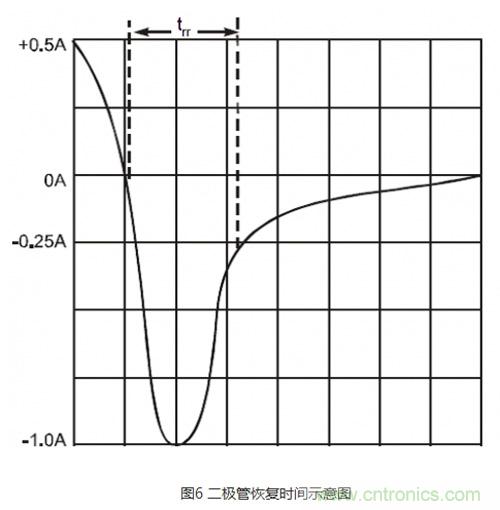 如圖6所示,二極管的反向恢復(fù)時間為電流通過零點(diǎn)由正向轉(zhuǎn)換成反向,再由反向轉(zhuǎn)換到規(guī)定低值的時間間隔,實際上是釋放二極管在正向?qū)ㄆ陂g向PN結(jié)的擴(kuò)散電容中儲存的電荷。反向恢復(fù)時間決定了二極管能在多高頻率的連續(xù)脈沖下做開關(guān)使用,如果反向脈沖的持續(xù)時間比反向恢復(fù)時間短,則二極管在正向、反向均可導(dǎo)通就起不到開關(guān)的作用。PN結(jié)中儲存的電荷量與反向電壓共同決定了反向恢復(fù)時間,而在高頻脈沖下不但會使其損耗加重,也會引起較大的電磁干擾。所以知道二極管的反向恢復(fù)時間正確選擇二極管和合理設(shè)計電路是必要的,選擇二極管時應(yīng)盡量選擇PN結(jié)電容小、反向恢復(fù)時間短的,但大多數(shù)廠家都不提供該參數(shù)數(shù)據(jù)。