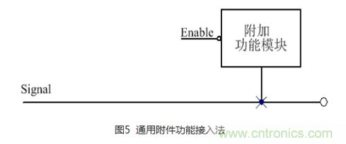 在高速信號線上,通常會附加一些功能,這些功能通常會帶來不利的影響,如會產(chǎn)生很大的寄生電容,這個(gè)電容視具體的電路模塊而定。如果忽略這個(gè)電容,可能會影響這個(gè)信號的頻率。最不幸的是,就算您注意到了這個(gè)電容,由于附加的功能模塊產(chǎn)生的電容太大,似乎也無能為力。通用附件功能接入法如圖5所示: