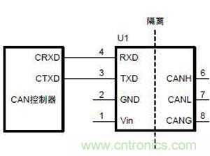 干擾不但影響信號,更嚴(yán)重的會導(dǎo)致板子死機(jī)或者燒毀,所以接口和電源的隔離是抗干擾的第一條“軍規(guī)”.隔離的主要目的是:避免地回流燒毀電路板和限制干擾的幅度,保護(hù)控制器不死機(jī)。如圖3所示,為未隔離時,兩個節(jié)點的地電位不一致,導(dǎo)致有回流電流,產(chǎn)生共模信號,CAN的抗共模干擾能力是-12~7V,超過這個差值則出現(xiàn)錯誤,如果共模差超過±36V,燒毀收發(fā)器或者電路板。