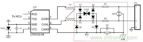 增加隔離后,是否萬事大吉了?肯定不是,隔離只是阻擋,如果干擾強(qiáng)度很高,比如達(dá)到2KV浪涌,隔離也會被破壞。所以要想達(dá)到更高的防護(hù)等級,必須增加防浪涌電路。如圖6所示,為致遠(yuǎn)電子高速總線標(biāo)準(zhǔn)防浪涌保護(hù)電路。