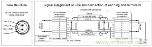 帶屏蔽層的CAN線,可以良好地抵御電場的干擾,等于整個屏蔽層是一個等勢體,避免CAN導(dǎo)線受到干擾。如圖9所示,為一個標(biāo)準(zhǔn)的屏蔽雙絞線,CANH和CANL通過鋁箔和無氧銅絲屏蔽網(wǎng)包裹,如圖9所示。需要注意的是和與接插件的連接,在連接部分允許有短于25 mm 的電纜不用雙絞。