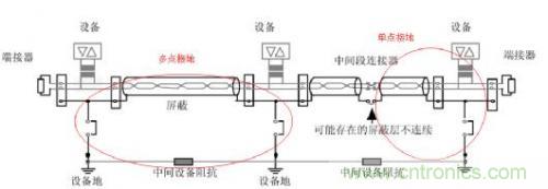 在CAN的應(yīng)用場合,由于距離一般都較遠(yuǎn),所以大部分采用屏蔽層單點接地的原則,在干線上找一點將屏蔽層用導(dǎo)線直接接地,該點應(yīng)是所受干擾最小的點,同時該點位于網(wǎng)絡(luò)中心附近。