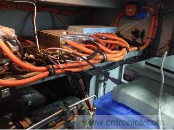 遠(yuǎn)離干擾源是最簡單的抗干擾方法,如果CAN線與強(qiáng)電干擾源遠(yuǎn)離0.5米,干擾就基本影響不到了??墒窃趯嶋H布線中,經(jīng)常遇到空間太小而不得不和強(qiáng)電混在一起,如圖12所示,為某新能源汽車的驅(qū)動系統(tǒng),CAN線與驅(qū)動線混在一起,結(jié)果導(dǎo)致干擾很大。只要與CAN并行的驅(qū)動線,具備2A/秒的電流變化,就會耦合出強(qiáng)磁場而導(dǎo)致CAN線上出現(xiàn)干擾脈沖。所以CAN線必須要和電流會劇烈變化的線纜遠(yuǎn)離。比如繼電器、電磁閥、逆變器、電機(jī)驅(qū)動線等。
