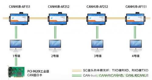 抗干擾的終極手段就是把CAN轉(zhuǎn)化為光纖傳輸,光纖是一種無法被電磁干擾的傳輸介質(zhì)。如果前5種抗干擾手段均無法解決干擾問題,可以把CAN轉(zhuǎn)化為光纖,實現(xiàn)“無懈可擊”。如圖15所示。為使用致遠(yuǎn)電子的CANHub-AF1S1和CANHub-AF2S2組合的光纖主干網(wǎng)絡(luò)。