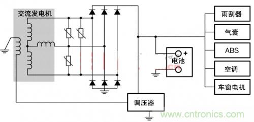 壓敏電阻為直流電壓較低的汽車應(yīng)用提供了高浪涌電流電路保護(hù),不論這些應(yīng)用在汽車的乘客艙內(nèi)還是在引擎蓋下。比如,MOV可以以Y形或三角形配置與交流發(fā)電機(jī)的繞組線圈連接,以鉗制瞬態(tài)電壓。
