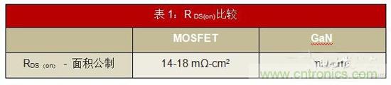 • 較低的RDS(on):如表1所示,GaN的MOSFET面積為RDS(on)的一半。這直接使電路中傳導(dǎo)損耗降低了50%。因此,您可以在設(shè)計中使用較小的散熱器和更簡單的熱管理。
