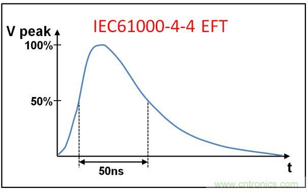 電快速瞬變(EFT)測試的是,將大量極快的瞬變脈沖耦合到信號線上,系統(tǒng)與外部開關電路關聯(lián)的瞬變干擾,這類電路能夠以容性方式耦合至通信端口。EFT的纏上包括繼電器和開關觸點抖動,或者因為感性或容性負載切換而產生的瞬變, 而所有這些在工業(yè)環(huán)境中都很常見。EC 61000-4-4中定義的 EFT測試,就是去模擬這些事件產生的干擾。