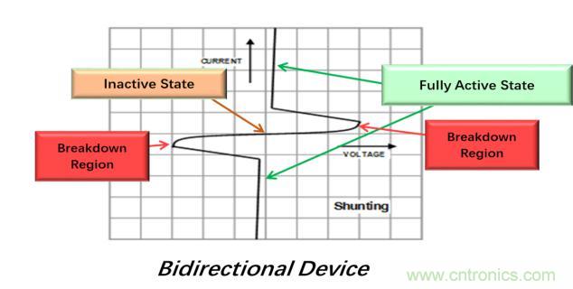 TISP的非線性電壓-電流特性通過轉移產生的電流來限制過壓。作為晶閘管,TISP具有非連續(xù)電壓-電流特性,它是由于高電壓區(qū)和低電壓區(qū)之間的切換動作而導致的。在TISP器件切換到低電壓狀態(tài)之前,它具有低阻抗接地路徑以分流瞬變能量,雪崩擊穿區(qū)域則導致了箝位動作。