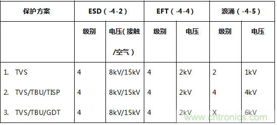 按照以上的規(guī)范要求和設計原則,下面我們提供三種不同級別的EMC防護解決方案,這些方案都已經經過了第三方獨立EMC兼容性測試的認證。方案中用到的元器件包括: