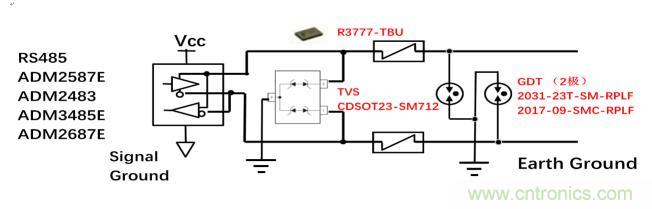 在這個方案中,由TVS(CDSOT23-SM712)提供次級保護, TISP(TISP4240M3BJR-S)則提供主保護,主保護器件和次級保護器件之間的協(xié)調以及過流保護是利用Bourns專利技術的過流保護器件TBU(TBU-CA065-200-WH)實現(xiàn)的。