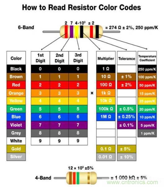 這里有一張簡(jiǎn)單的圖表,可以解釋電阻器的顏色編碼規(guī)則。