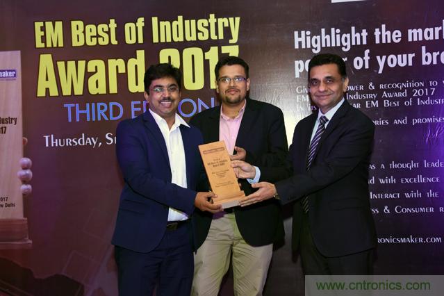 圖片說明:印度銷售經(jīng)理Bharat Kapoor(左)以及印度和南非現(xiàn)場應(yīng)用經(jīng)理Navneet Vinaik(中)接受EM行業(yè)最佳獎(jiǎng)的最佳電路保護(hù)組件獎(jiǎng)。