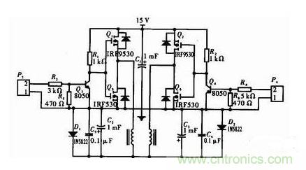 是由兩只p溝道MOSFET。Q1、Q2和兩只n溝道MOSFET Q5、Q6組成。在這里沒有采用4只n溝道MOSFET,原因是驅動電路復雜,如果采用上面的驅動電路接近電源的兩個導體管不能完全導通,發(fā)熱量為接近地一側導體管4倍以上,功耗增加,所以采用對管逆變即減小了功耗,而且驅動電路簡單。通過控制4個導體管的開關速度再通過低通濾波器即可實現(xiàn)DC/AC功能。