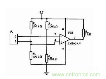 由于終端負載一定,所以電流采樣實際等同于一個峰值檢測的過程,此電路實際是一個峰值檢測電路,P3為信號的2個輸入端,調整R10,R11和R17、R18取值來實現(xiàn)峰值測功能,電路中的阻值并不準確,需要實際中根據(jù)信號的幅值來調整R10、R11和R17、R18阻值和比值。R14、R15、R19、R20的電流為模擬比較器內部偏置電流的10倍以上,電阻的阻值盡可能大,這樣既減小了功耗也保證了系統(tǒng)的穩(wěn)定性。Y3采用模擬比較器LM393,LM393內部為開集電極輸出,應用的時候輸出端要接一個上拉電阻,電路如圖3所示。