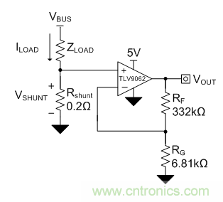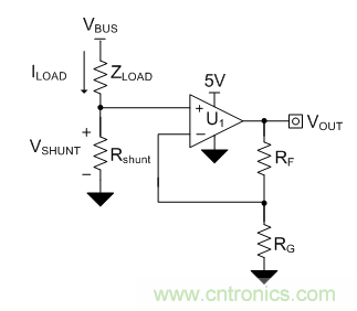 在設(shè)計(jì)低側(cè)電流感應(yīng)電路時(shí),高性價(jià)比的方法之一是使用非反相配置運(yùn)算放大器(op amp)。圖1是使用運(yùn)算放大器的典型低側(cè)電流感應(yīng)電路原理圖。