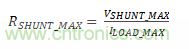 計(jì)算最大分流電阻。當(dāng)來(lái)自負(fù)載(ILOAD)的電流流過(guò)分流電阻器(RSHUNT)時(shí),分流電阻器上會(huì)形成一個(gè)電壓電位(VSHUNT)。VSHUNT被視為系統(tǒng)負(fù)載的“接地端”。因此,建議將VSHUN的最大負(fù)載電流保持在100mV以下,以避免在與其它具有真正0V接地的系統(tǒng)連接時(shí)出現(xiàn)問(wèn)題。公式2用于計(jì)算RSHUNT值:
