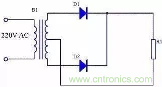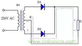 半波整流電路見下圖。其中B1是電源變壓器,D1是整流二極管,R1是負載。B1次級是一個方向和大小隨時間變化的正弦波電壓,波形如圖2所示。0~π期間是這個電壓的正半周,這時B1次級上端為正下端為負,二極管D1正向導通,電源電壓加到負載R1上,負載R1中有電流通過;π~2π期間是這個電壓的負半周,這時B1次級上端為負下端為正,二極管D1反向截止,沒有電壓加到負載R1上,負載R1中沒有電流通過。在 2π~3π、3π~4π等后續(xù)周期中重復上述過程,這樣電源負半周的波形被“削”掉,得到一個單一方向的電壓,波形如圖3所示。由于這樣得到的電壓波形大小還是隨時間變化,我們稱其為脈動直流。