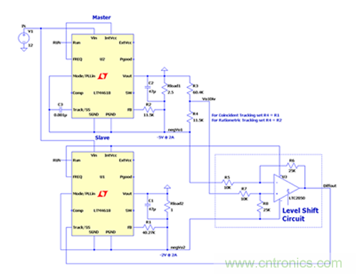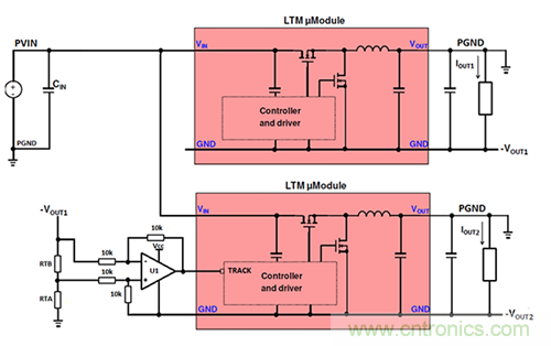 TRACK引腳輸入允許μModule穩(wěn)壓器通過將跟蹤信號(即,主μModule穩(wěn)壓器的輸出電壓軌的分壓版本)提供給從μModule穩(wěn)壓器的TRACK引腳來跟蹤另一電源軌的輸出電壓斜坡。每個μModule穩(wěn)壓器內部控制器所看到的TRACK引腳電壓與其μModuleGND引腳相關,但在需要配置兩個負輸出轉換器進行跟蹤的應用中,μModule穩(wěn)壓器的GND引腳可以處于不同的電位。主和從GND引腳電位差異意味著主設備提供的跟蹤信號不能直接施加到從設備的跟蹤引腳。在這些類型的應用中,需要額外的考慮以確保從機相位能夠看到來自主機相位的正確參考的跟蹤信號。