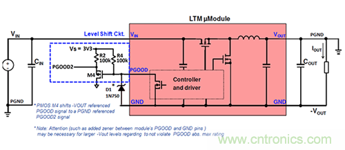 PGOOD輸出引腳指示μModule穩(wěn)壓器輸出電壓是否處于穩(wěn)壓(PGOOD高電平)范圍內(PGOOD低電平)。模塊內部PGOOD引腳是開漏MOSFET,因此需要一個上拉電阻來提供偏置電壓。如果要在負輸出配置中使用PGOOD功能,μModule穩(wěn)壓器看到的PGOOD信號必須適當地電平移動到PGND參考信號,以供系統(tǒng)進一步使用。