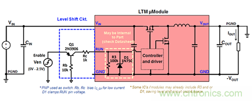 由于接地電平(PGND和GND)的不同,配置控制電路需要比功率級更多考慮。μModule穩(wěn)壓器參考其自身GND引腳的引腳電壓,但其提供的輸出電壓是相對于系統(tǒng)地(PGND)的。在此配置中,要將任何PGND參考的外部控制信號(例如RUN,TRACK,PGOOD等)傳送到μModule穩(wěn)壓器,需要將信號轉換為μModule穩(wěn)壓器的接地參考GND(-V OUT)。