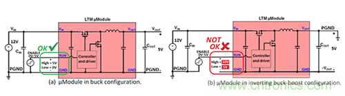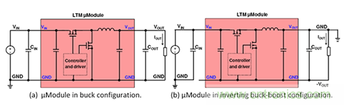 圖1.僅僅幾個連接變化將一個降壓μModule穩(wěn)壓器(a)轉換為一個負輸出穩(wěn)壓器(b)