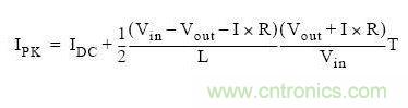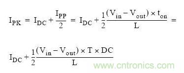 通過(guò)上圖我們可以看到,流過(guò)電感的最大電流為DC電流加開(kāi)關(guān)峰峰電流的一半。上圖也稱為紋波電流。根據(jù)上述的公式,我們可以計(jì)算出峰值電流: