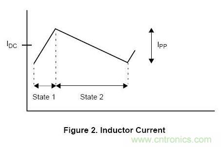 因此,當(dāng)電感上的電壓為正時(shí)(狀態(tài)1),電感上的電流就會(huì)增加;當(dāng)電感上的電壓為負(fù)時(shí)(狀態(tài)2),電感上的電流就會(huì)減小。通過(guò)電感的電流如圖2所示: