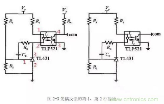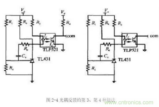 圖2-3所示接法的工作原理是:當輸出電壓升高時,原邊電流If增大,輸出電流Ic增大,由于Ic已經(jīng)超過了電壓誤差放大器的電流輸出能力,com腳電壓下降,占空比減小,輸出電壓減??;反之,當輸出電壓下降時,調(diào)節(jié)過程類似。