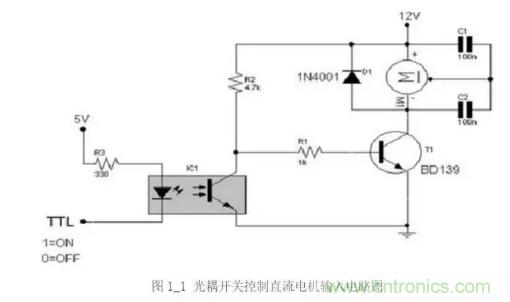 光耦(opticalcoupler)亦稱光電隔離器、光耦合器或光電耦合器。它是以光為媒介來傳輸電信號的器件,通常把發(fā)光器(紅外線發(fā)光二極管LED)與受光器(光敏半導(dǎo)體管)封裝在同一管殼內(nèi)。當輸入端加電信號時發(fā)光二極管發(fā)出光線,光敏三極管接受光線之后就產(chǎn)生光電流,從輸出端流出,從而實現(xiàn)了“電—光—電”轉(zhuǎn)換。典型應(yīng)用電路如下圖1-1所示。