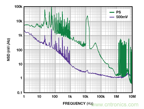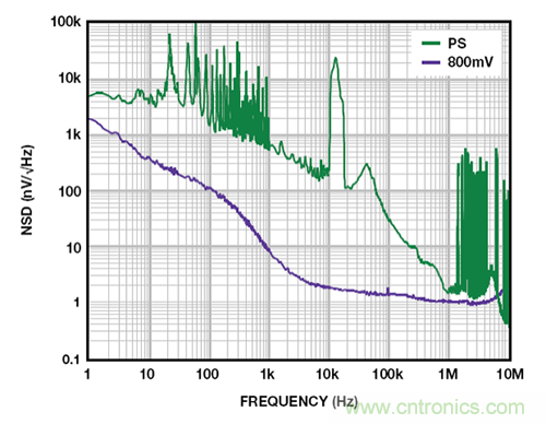 如 ADM7150 超低噪聲、高 PSRR 調(diào)節(jié)器一類的新型 LDO 實(shí)際上級聯(lián)了兩個(gè) LDO,因此,結(jié)果得到的 PSRR 約為各個(gè)級之和。這些 LDO 要求略高的裕量電壓,但能夠在 1 MHz 條件下實(shí)現(xiàn)超過 60 dB 的 PSRR,較低頻率下,PSRR 可以遠(yuǎn)超 100 dB。圖 7 所示為一個(gè) 5 V 的 ADM7150 的噪聲頻譜密度,其負(fù)載電流為 500 mA,裕量為 800 mV。10 Hz 至 100 kHz 范圍內(nèi),輸出噪聲為 2.2 μV rms。隨著裕量降至 600 mV,整流諧波開始顯現(xiàn),但當(dāng)輸出噪聲升至 2.3 μV rms 時(shí),其對噪聲的影響很小。