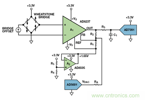 這個問題可通過圖 5 所示的電路來解決。電橋放大器A1是一個像AD8237 一樣的ICF儀表放大器。放大器A2,帶R4 和R5,將A1的零電平輸出設(shè)為中間電源。AD5601 8 位DAC對輸出進(jìn)行調(diào)整,通過RA使電橋失調(diào)為 0。然后,放大器的輸出由AD7091微功耗 12 位ADC數(shù)字化。