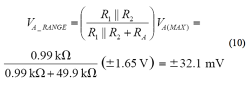 由于 DAC 可以擺動±1.65 V,因此,總失調(diào)調(diào)整范圍可通過由 RA以及 R1和 R2的并聯(lián)組合形成的分壓器給定,其計算方法如下: