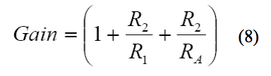其中,VIN(MAX)為傳感器預(yù)期的最大失調(diào)。等式(5)同時顯示,調(diào)整電路的插入會修改從輸入到輸出的增益。即使如此,其影響一般也很小,增益可以重新計算為: